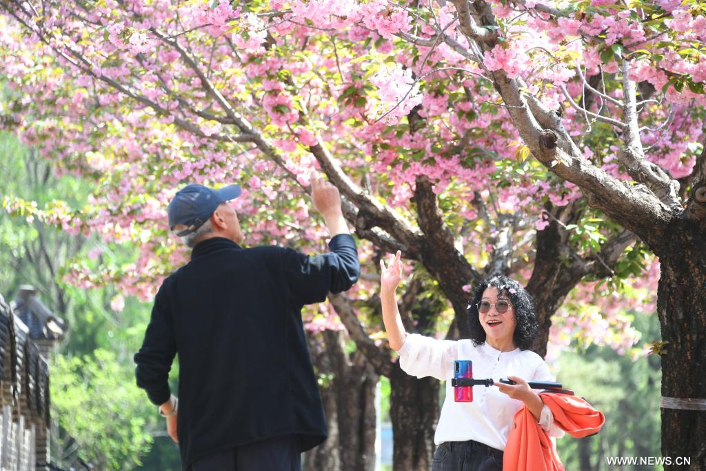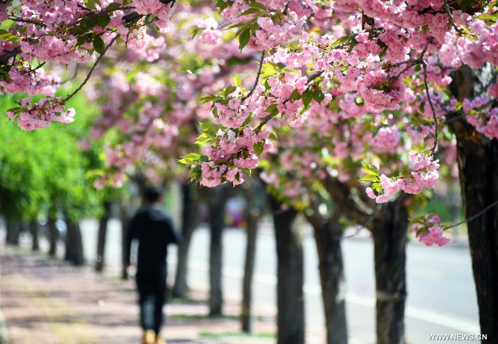 بكين 20 أبريل 2025 (شينخوا) في الصورة الملتقطة يوم 19 أبريل 2025، أزهار الكرز تتفتح على جانبي أحد الشوارع، حيث يتمتع الناس بمناظرها الخلابة في حي بينغقو بالعاصمة الصينية، بكين.