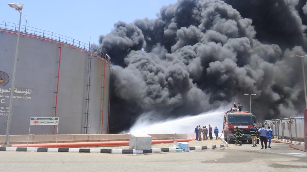 وأظهرت صور نشرتها وزارة الطاقة والنفط السودانية تصاعد أعمدة الدخان نتيجة الحريق بمستودعات النفط بمدينة بورتسودان.