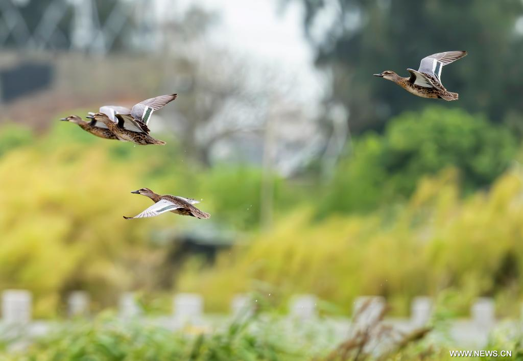 فوتشو 12 أكتوبر 2025 (شينخوا) في الصورة الملتقطة يوم 24 سبتمبر 2025، طيور مهاجرة تطير فوق الأراضي الرطبة في قرية شياوو في منطقة تشانغله بمقاطعة فوجيان في جنوب شرقي الصين.