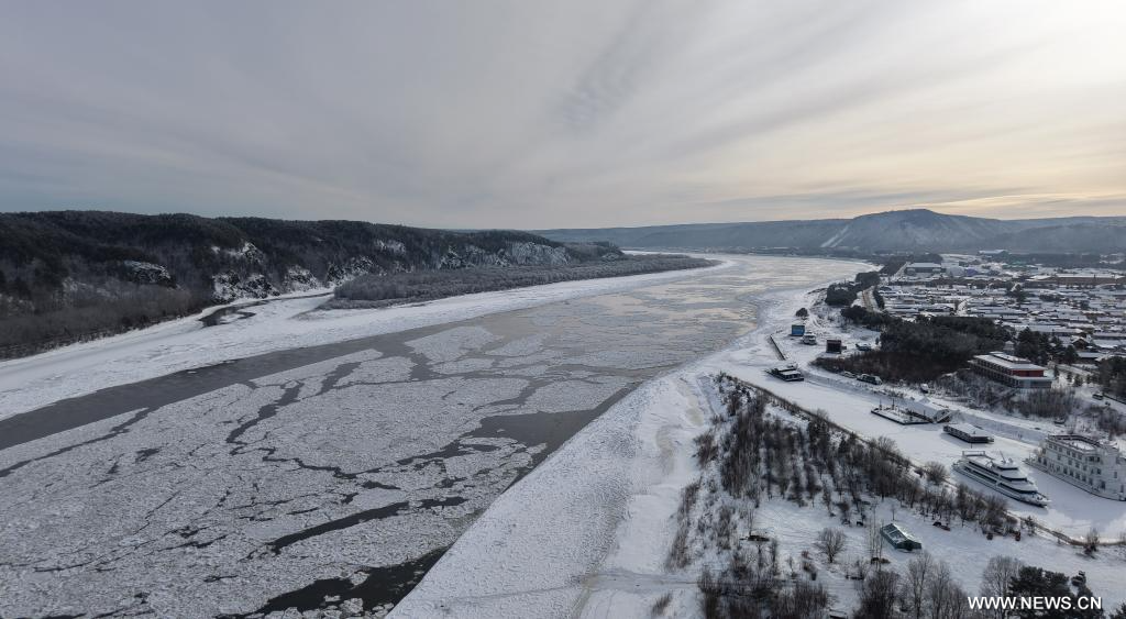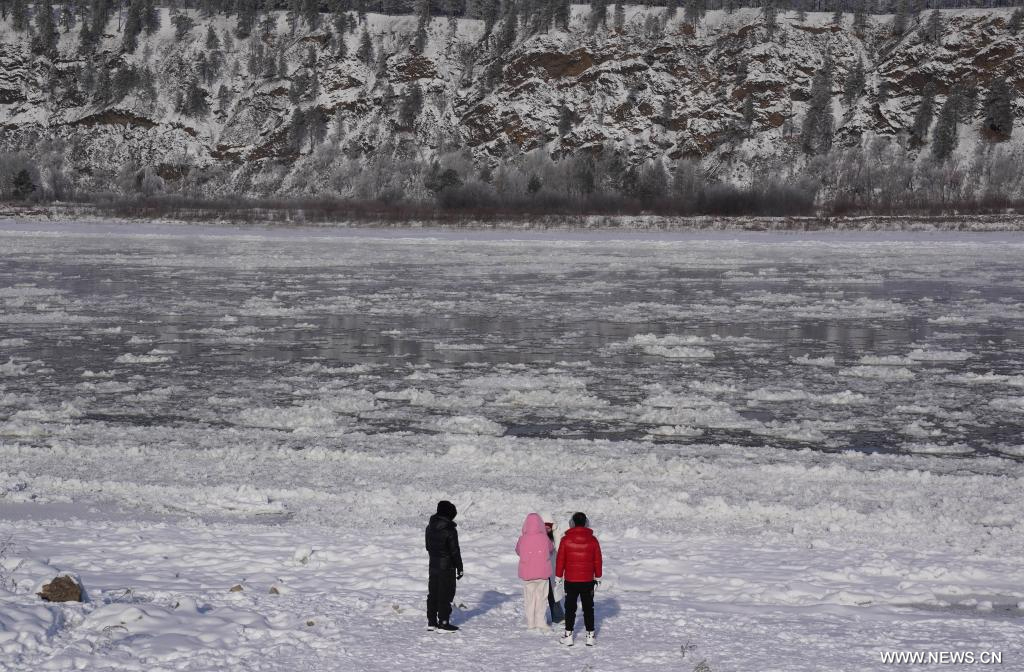 موخه 12 نوفمبر 2025 (شينخوا) في الصورة الملتقطة يوم 11 نوفمبر 2025، مناظر تدفق الجليد في قسم موخه لنهر هيلونغجيانغ في مقاطعة هيلونغجيانغ بشمال شرقي الصين.