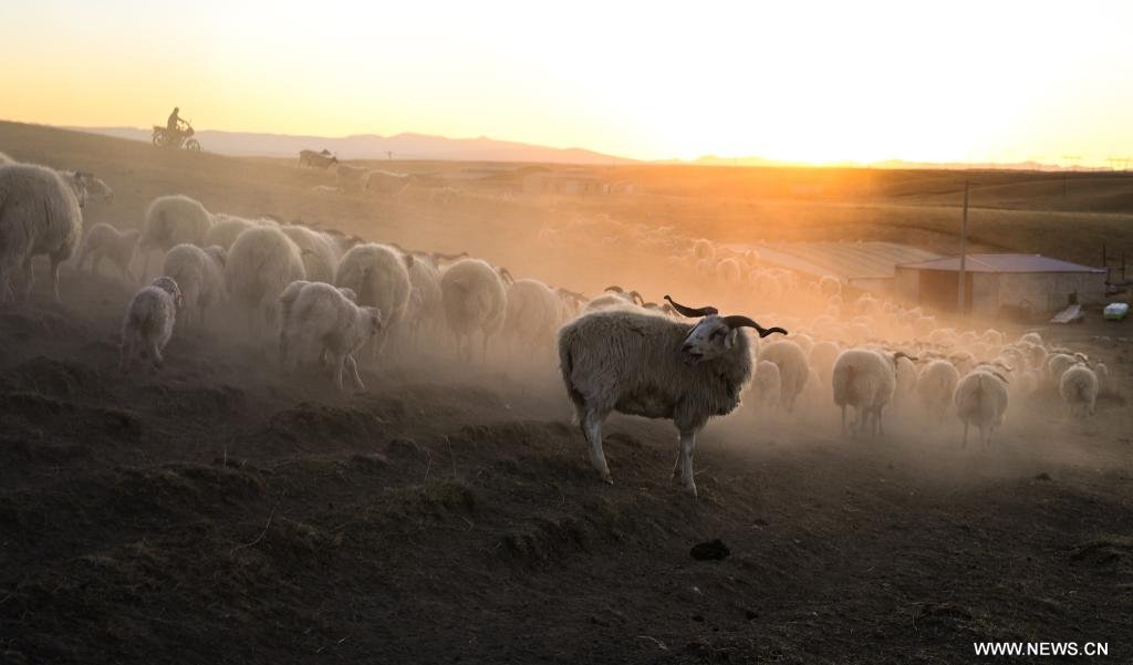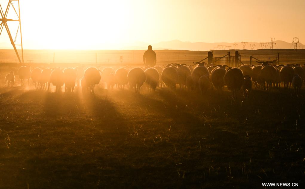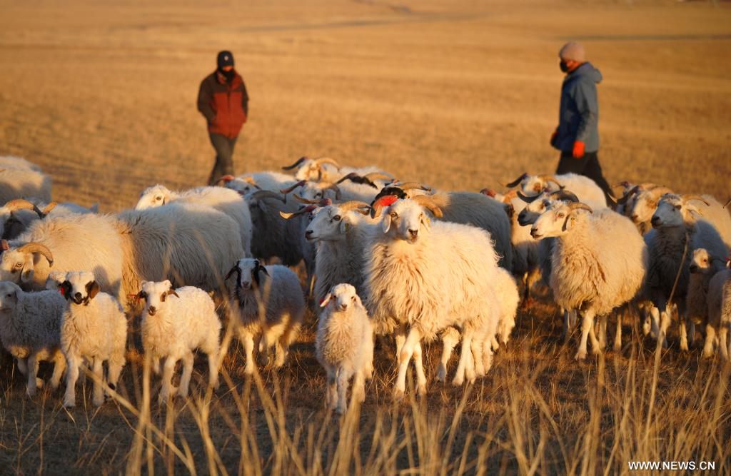 قانغتشا 16 نوفمبر 2025 (شينخوا) في الصورة الملتقطة يوم 13 نوفمبر 2025، رعاة يرعون الغنم في ولاية هايبي التبتية ذاتية الحكم في مقاطعة تشينغهاي بشمال غربي الصين.