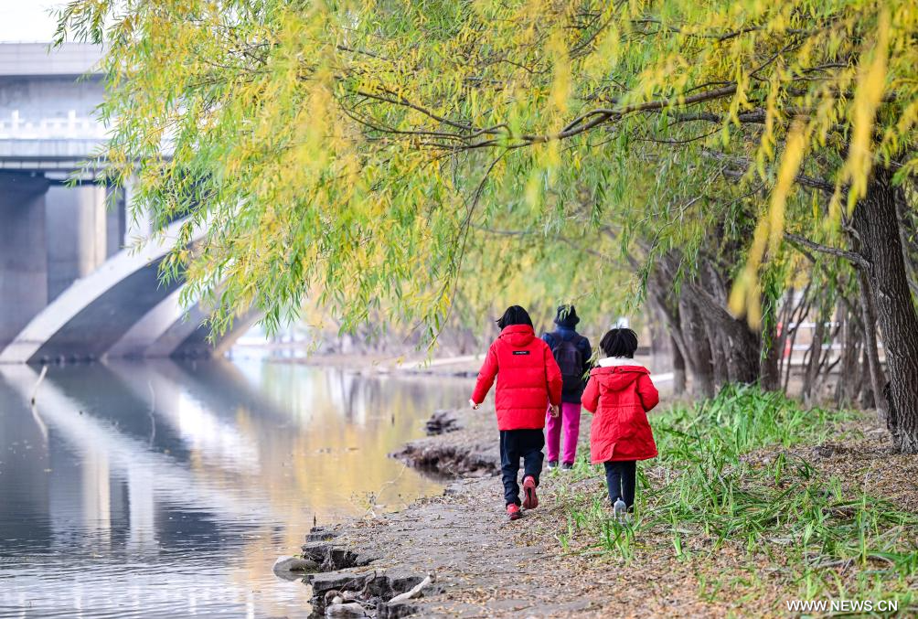 بكين 16 نوفمبر 2025 (شينخوا) في الصورة الملتقطة يوم 15 نوفمبر 2025، سياح يزورون حديقة إكسبو بكين للبستنة في يوم من أيام أوائل الشتاء في العاصمة الصينية، بكين.