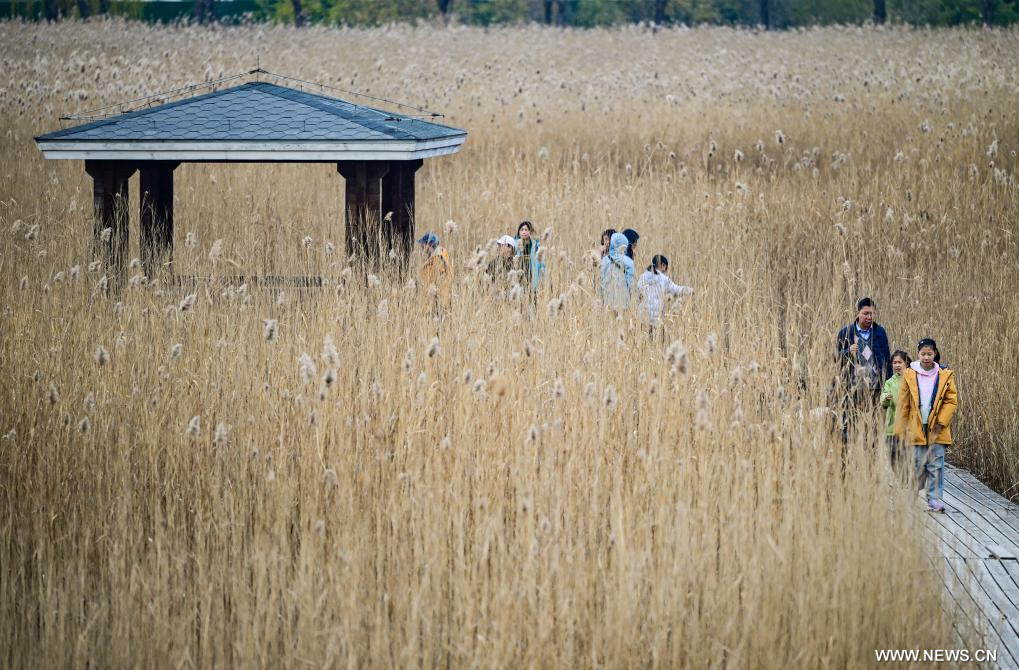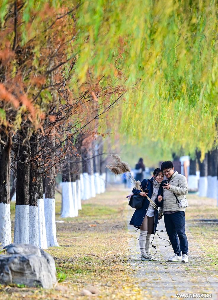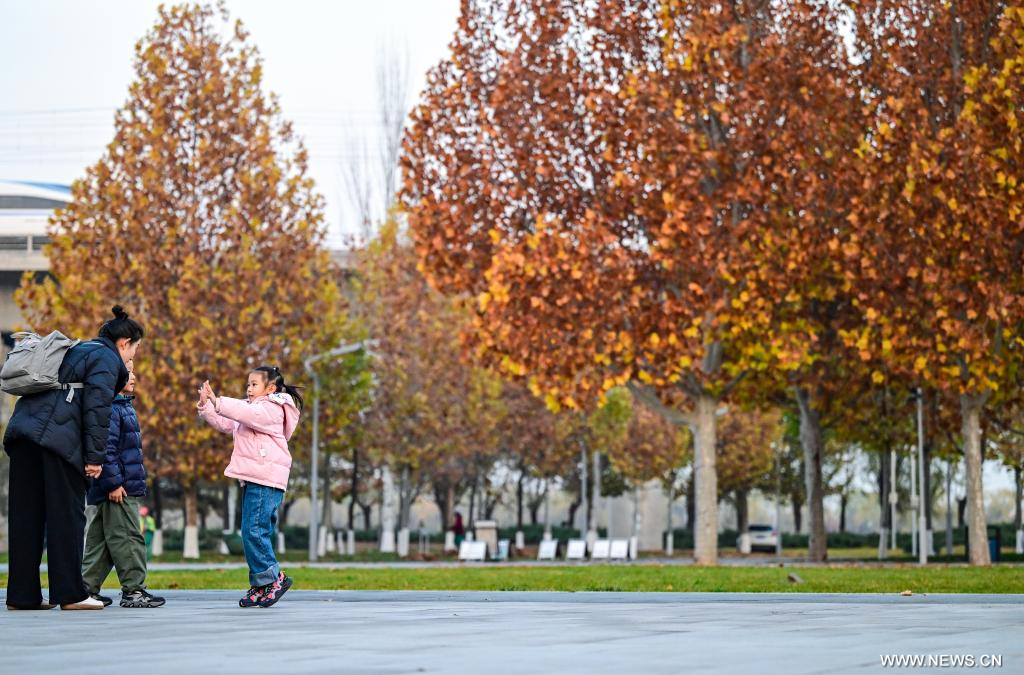 بكين 16 نوفمبر 2025 (شينخوا) في الصورة الملتقطة يوم 15 نوفمبر 2025، سياح يزورون حديقة إكسبو بكين للبستنة في يوم من أيام أوائل الشتاء في العاصمة الصينية بكين.