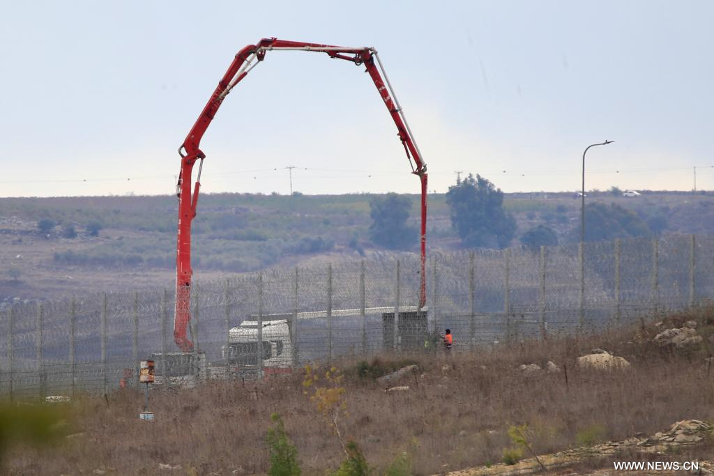 يارون 17 نوفمبر 2025 (شينخوا) في الصورة الملتقطة يوم 16 نوفمبر 2025، عمال إسرائيليون يستخدمون آلات ثقيلة لبناء جدار عند حدود بلدة يارون جنوبي لبنان.