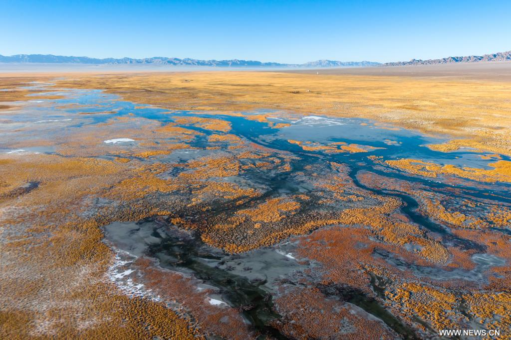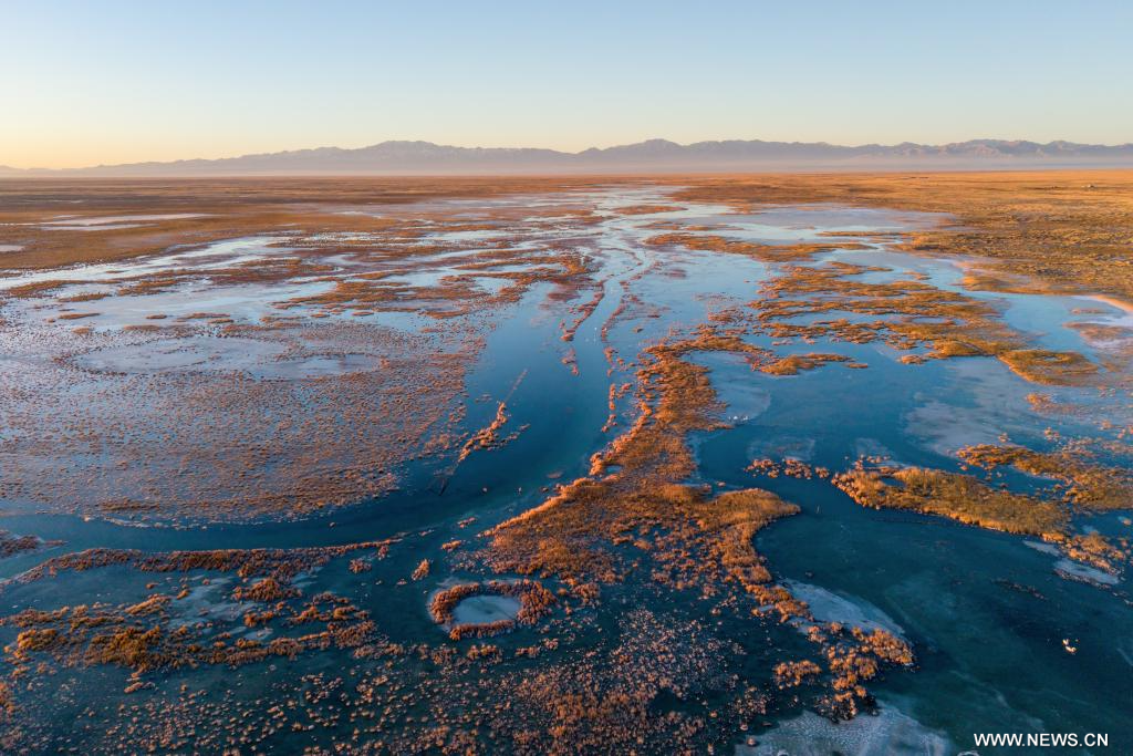 أكساي 17 نوفمبر 2025 (شينخوا) في الصورة الملتقطة يوم 14 نوفمبر 2025، مناظر جميلة لبحيرة شياوسوقان في محافظة أكساي ذاتية الحكم لقومية القازاق بمقاطعة قانسو في شمال غربي الصين.