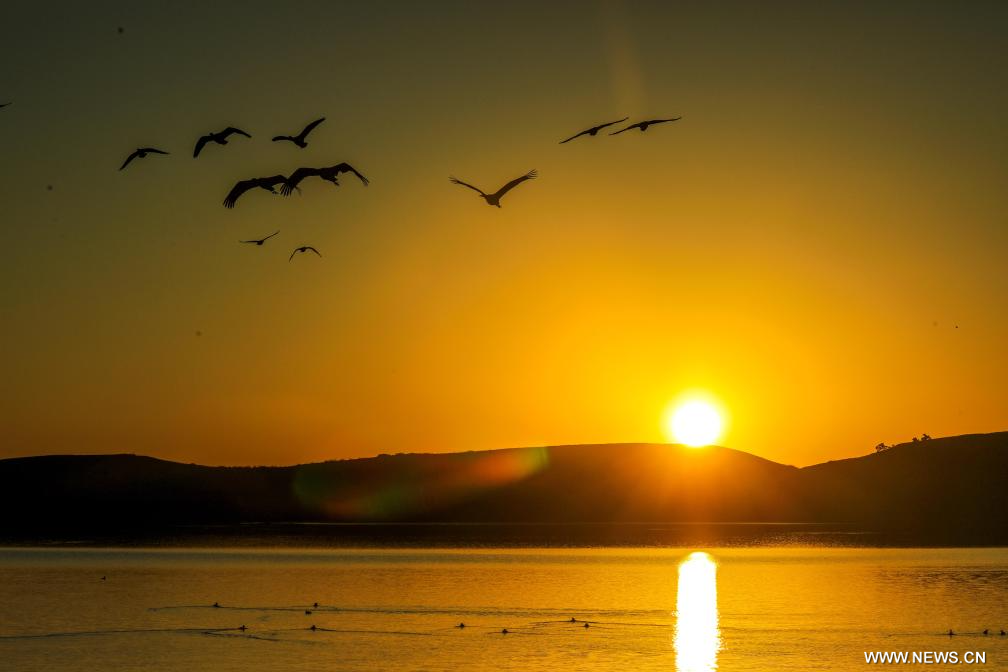 تشاوتونغ أول ديسمبر 2025 (شينخوا) في الصورة الملتقطة يوم 30 نوفمبر 2025، طيور الكركي سوداء العنق تحلق في محمية يوننان داشانباو الطبيعية الوطنية لطيور الكركي سوداء العنق في مدينة تشاوتونغ بمقاطعة يوننان جنوب غربي الصين.