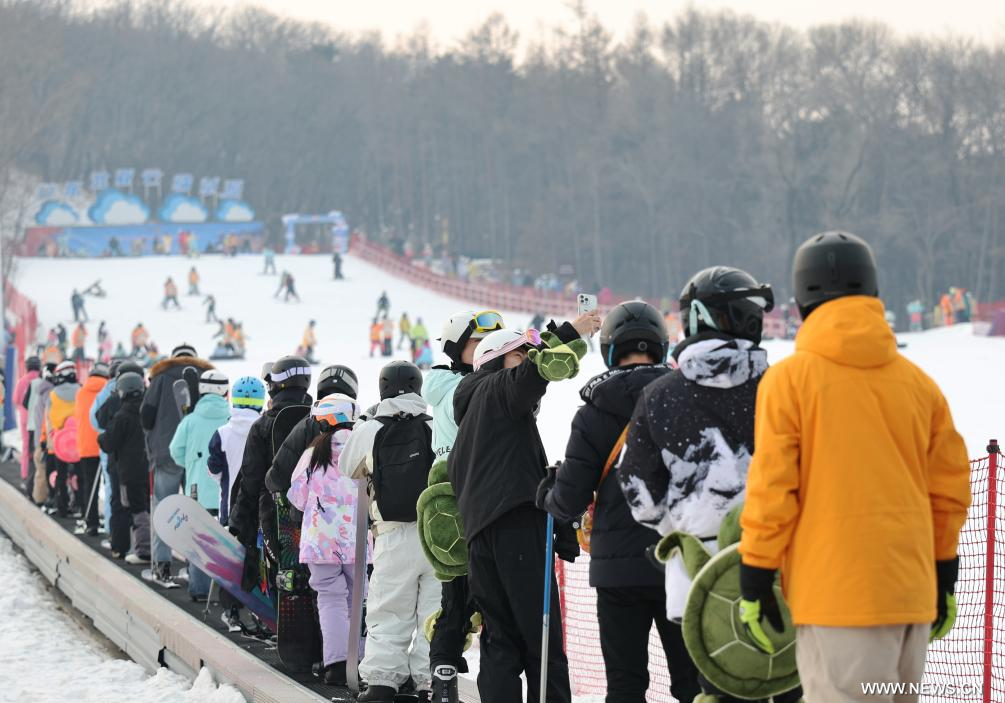 شنيانغ 7 ديسمبر 2025 (شينخوا) في الصورة الملتقطة يوم 6 ديسمبر 2025، هواة التزلج يصطفون لممارسة رياضتهم المفضلة في منتجع التزلج بمدينة شنيانغ، حاضرة مقاطعة لياونينغ بشمال شرقي الصين.
