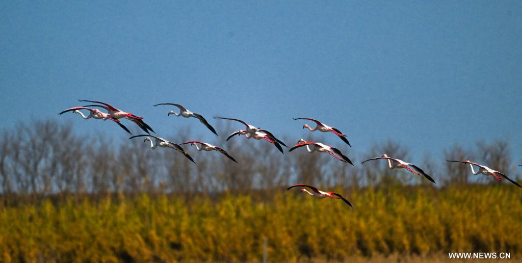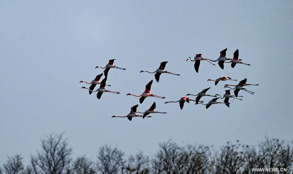 طيور النحام تحلق فوق أراض رطبة في شرقي الصين