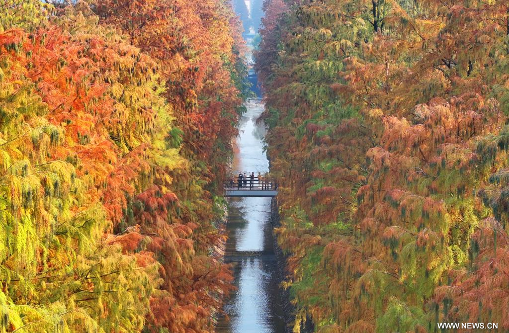 بكين 11 ديسمبر 2025 (شينخوا) في الصورة الملتقطة يوم 10 ديسمبر 2025، منظر شتوي خلاب في غابة ميتاسيكويا في قرية لونغتشياو بمقاطعة هونان بوسط الصين.