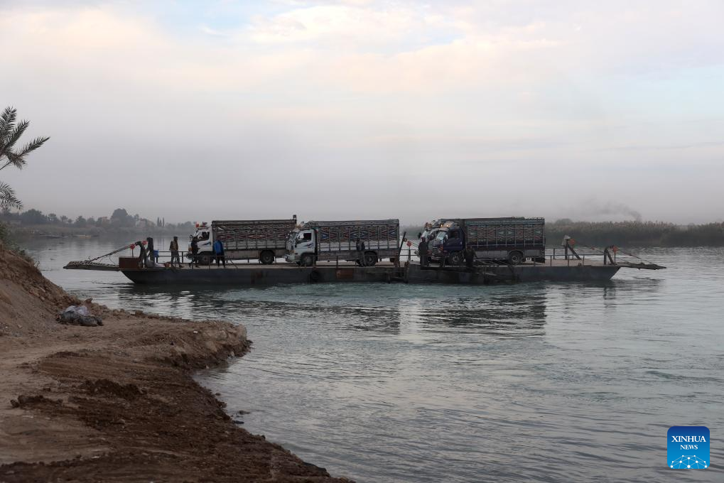 دير الزور، سوريا 16 ديسمبر 2025 (شينخوا) بينما تشقّ عبّارة معدنية ذات قاع مسطح طريقها ببطء عبر نهر الفرات تحت وطأة شاحنة محملة بالكامل، يسحب رجال كابلات فولاذية سميكة بأيديهم، في حين يقف الركاب متوترين على سطحها، يراقبون المياه وهي تقترب بشكل خطير من الحافة.