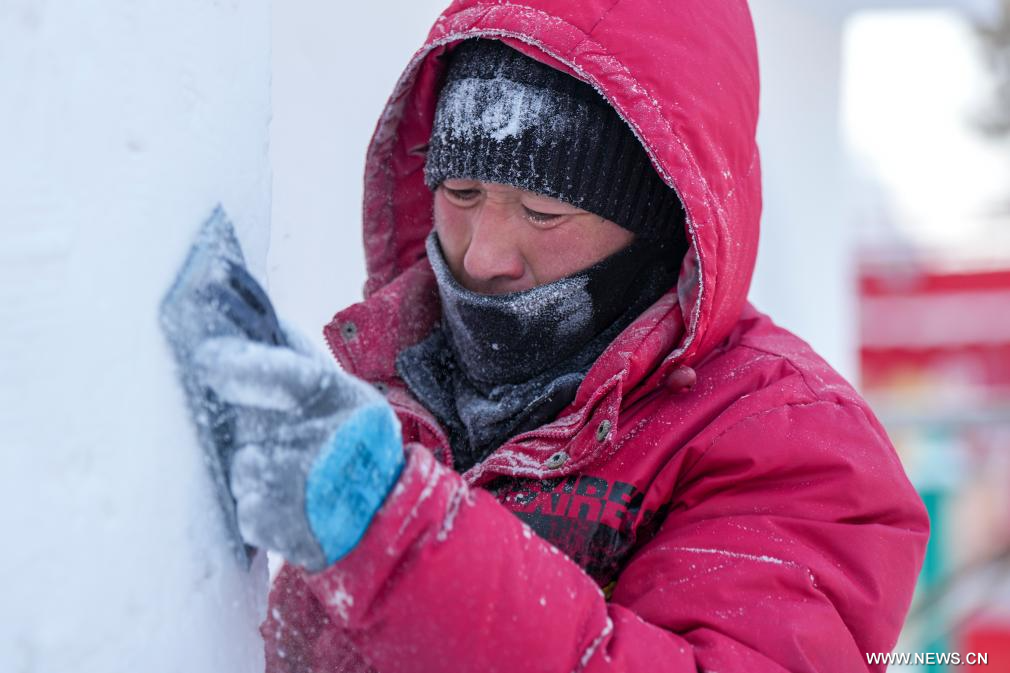 هاربين 27 ديسمبر 2025 (شينخوا) في الصورة الملتقطة يوم 26 ديسمبر 2025، حرفي يعمل على نحت تمثال ثلجي في معرض جزيرة الشمس الدولي الـ38 لفنون النحت على الثلج في مدينة هاربين حاضرة مقاطعة هيلونغجيانغ بشمال شرقي الصين.