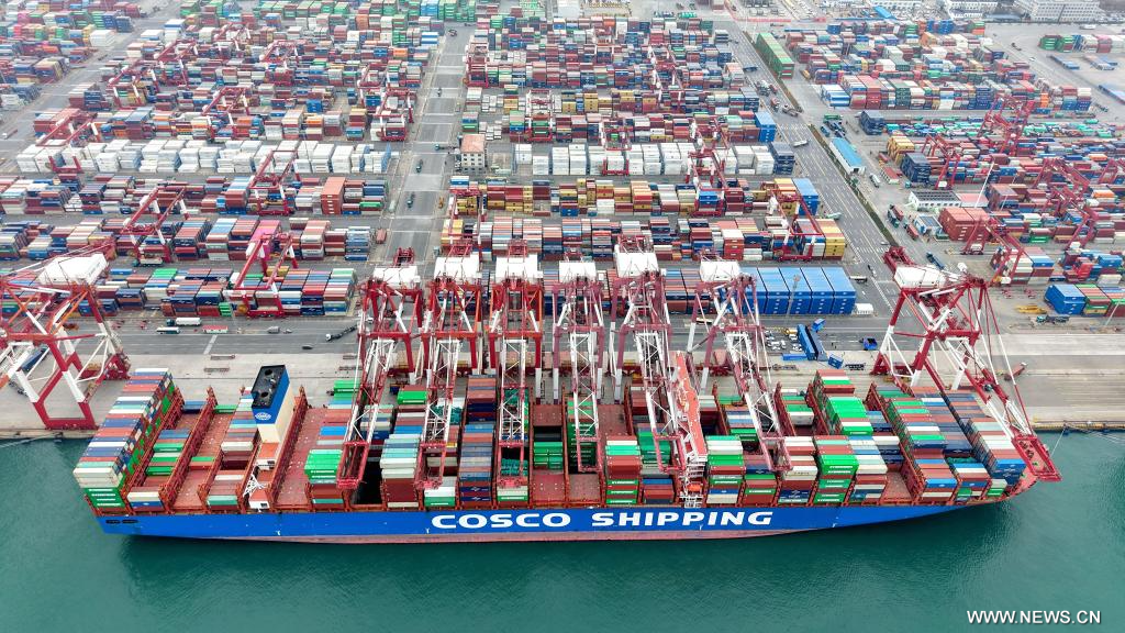 جينان 28 ديسمبر 2025 (شينخوا) في الصورة الملتقطة يوم 27 ديسمبر 2025، سفينة شحن تقوم بتحميل وتفريغ الحاويات في ميناء تشينغداو بمقاطعة شاندونغ شرقي الصين. وتجاوز حجم مناولة البضائع في موانئ مقاطعة شاندونغ العام الجاري 1.9 مليار طن يوم السبت الماضي، بينما تجاوز حجم الحاويات 47 مليون حاوية معيارية مكافئة بحجم 20 قدما.