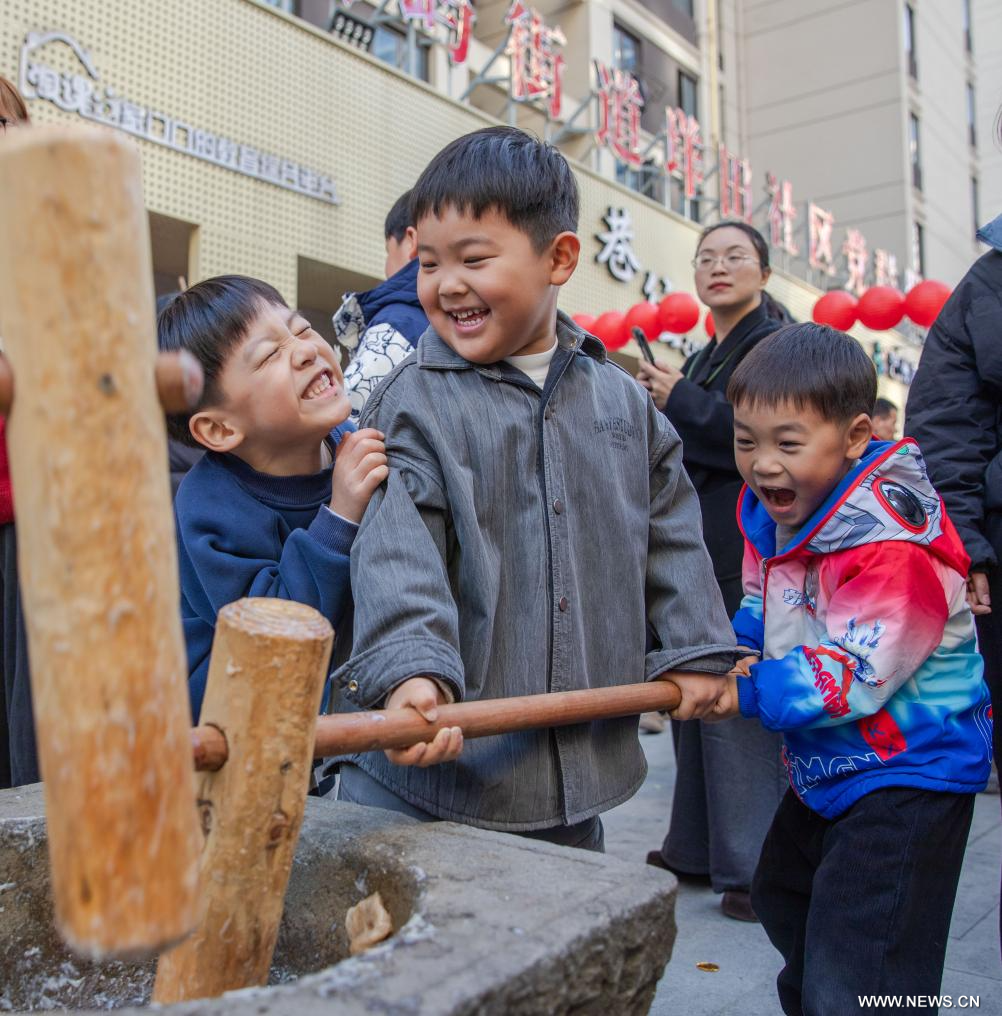 بكين 31 ديسمبر 2025 (شينخوا) في الصورة الملتقطة يوم 28 ديسمبر 2025، أطفال يجربون صنع "ماتسي"، وهو كعك تقليدي مصنوع من الأرز اللزج، في أحد المجتمعات السكنية بمدينة ونتشو في مقاطعة تشجيانغ بشرقي الصين، فيما تنظم أنشطة متنوعة في أنحاء البلاد احتفالا بقدوم العام الجديد.