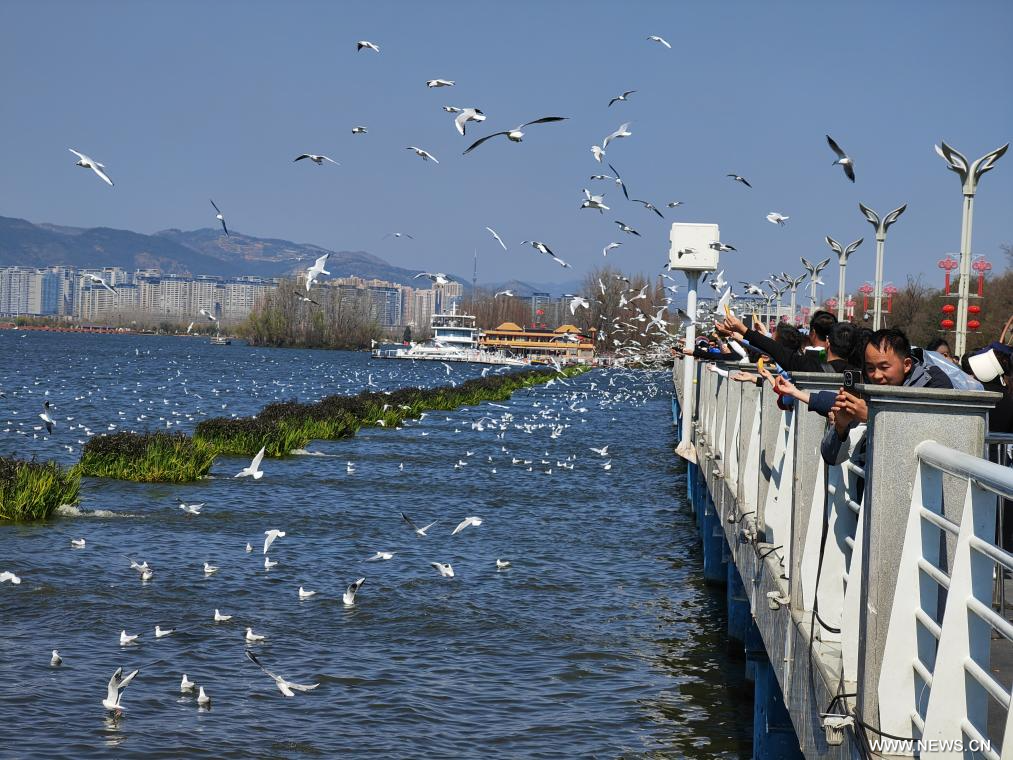كونمينغ 17 فبراير 2026 (شينخوا) في الصورة الملتقطة يوم 16 فبراير 2026، زوار يطعمون طيور النورس أحمر المنقار عند سد هايقنغ في مدينة كونمينغ، حاضرة مقاطعة يوننان في جنوب غربي الصين، حيث تجمع العديد من الزوار والمقيمين المحليين عند السد للاستمتاع بعطلة عيد الربيع.