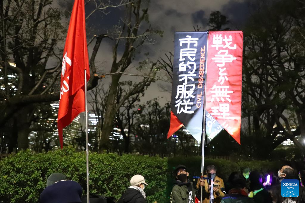 وعلى الرغم من برودة الجو، رفع المتظاهرون أمام مبنى البرلمان الوطني (الدايت) لافتات كتب عليها "لا للحرب!" و"توقفوا عن انتهاك الدستور!"، كما قرأوا بصوت جماعي المادة التاسعة من الدستور الياباني، مؤكدين تمسكهم بمبادئ بلادهم السلمية.