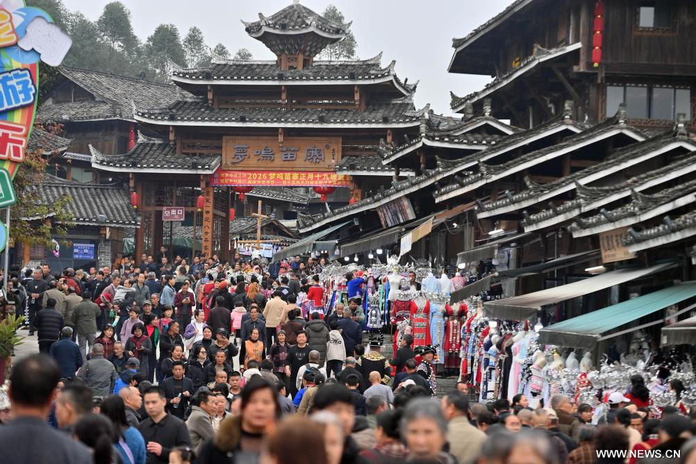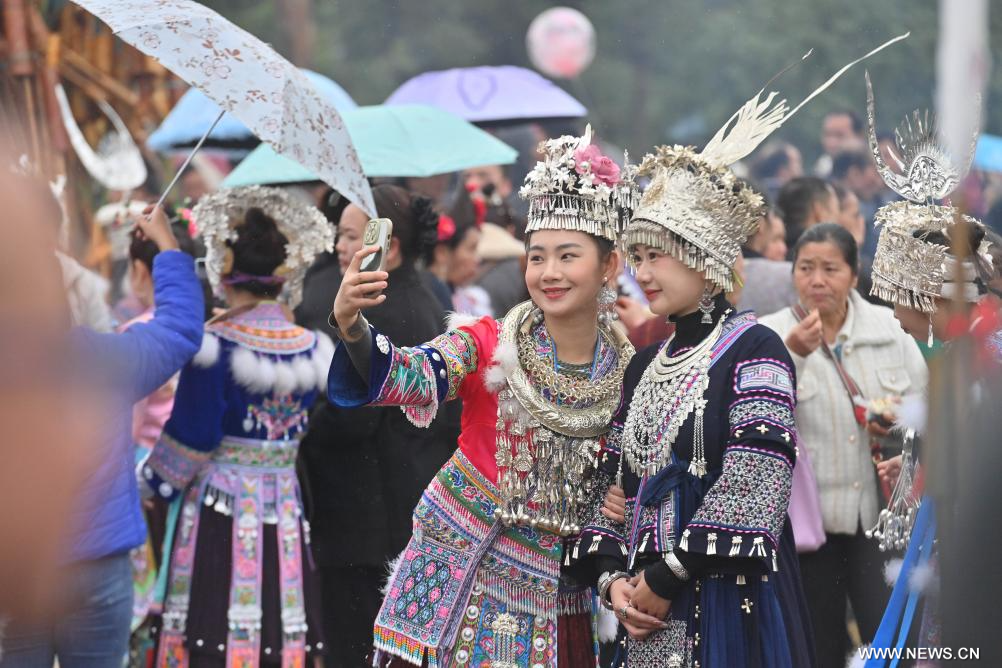 ليوتشو 10 مارس 2026 (شينخوا) في الصورة الملتقطة يوم 24 فبراير 2026، نساء من قومية مياو يقدمن عرضا شعبيا خلال عيد "بوهوي" في محافظة رونغشوي الذاتية الحكم لقومية مياو في منطقة قوانغشي ذاتية الحكم لقومية تشوانغ جنوبي الصين.