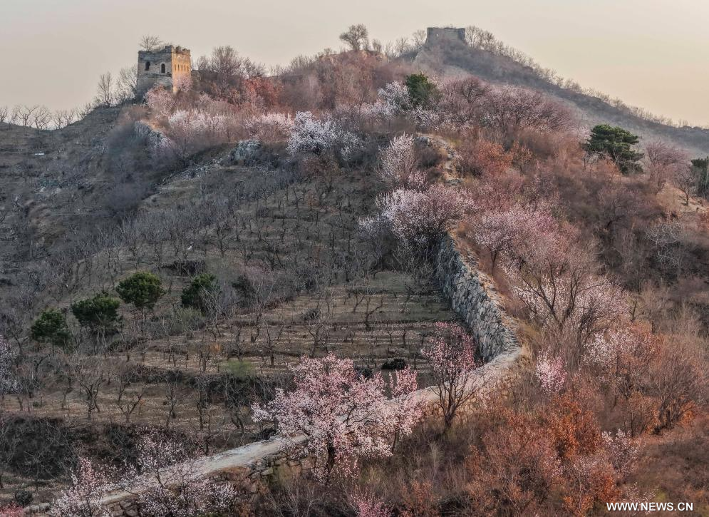 بكين 29 مارس 2026 (شينخوا) في الصورة الملتقطة جوا يوم 28 مارس 2026، زهور تتفتح بالقرب من جزء من سور الصين العظيم في تسونهوا في مقاطعة خبي في شمالي الصين.