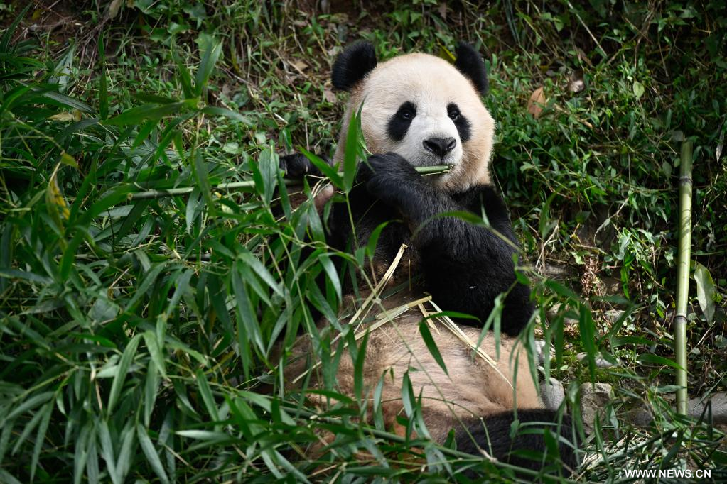 في الصورة الملتقطة يوم 17 أكتوبر 2022، ذكر الباندا العملاقة، جينغ جينغ، يتغذى على نبات البامبو في قاعدة ياآن التابعة للمركز الصيني لحماية وبحوث الباندا العملاقة في مقاطعة سيتشوان جنوب غربي الصين. غادر اثنان من الباندا العملاقة قاعدتهما التكاثرية في سيتشوان اليوم (الثلاثاء) متوجهين إلى قطر، في إطار برنامج التعاون في بحوث وحماية حيوان الباندا العملاقة بين البلدين. وسيتم نقل حيواني الباندا، الأنثى سي هاي (ثلاث سنوات) والذكر جينغ جينغ (أربع سنوات)، إلى قطر على متن طائرة خاصة من مطار تشنغدو شوانغليو الدولي.