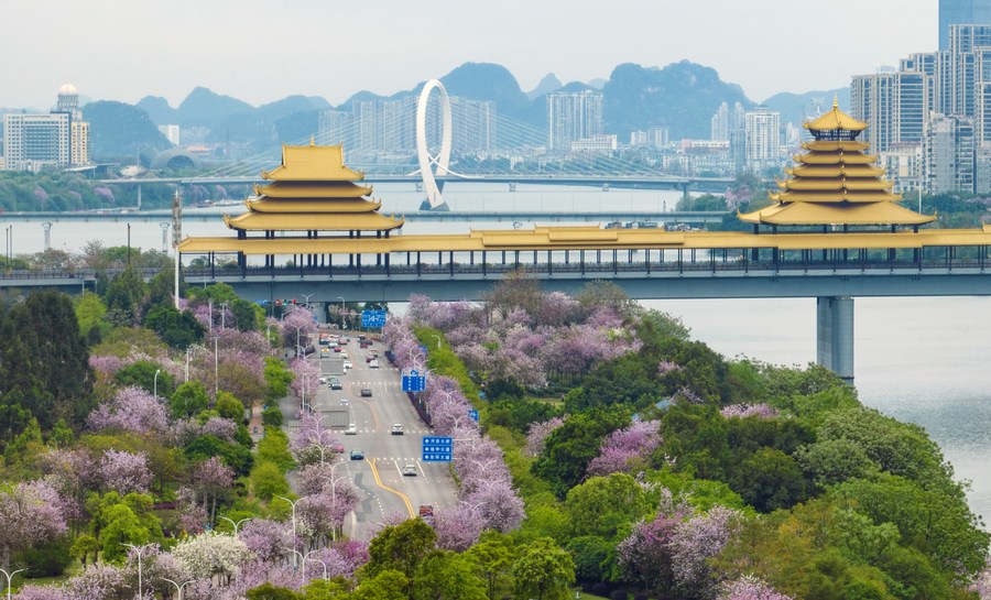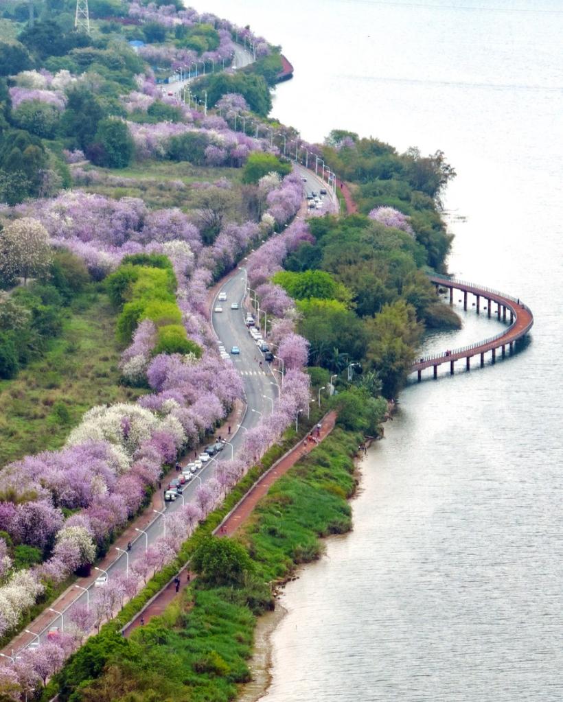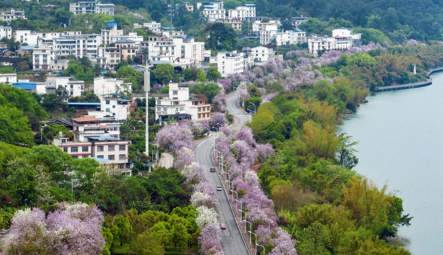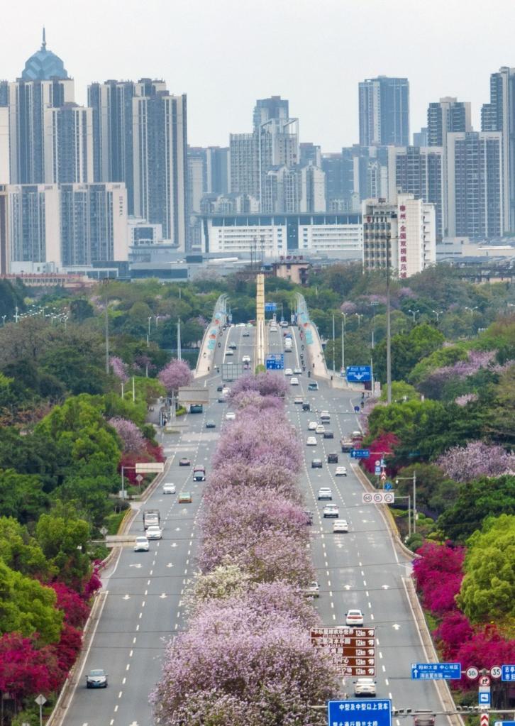 ليوتشو 6 أبريل 2023 (شينخوا) في الصورة الملتقطة يوم 5 أبريل 2023، مناظر جوية لتفتح زهور البوهينيا في طرق مدينة ليوتشو في منطقة قوانغشي ذاتية الحكم لقومية تشوانغ بجنوبي الصين.■