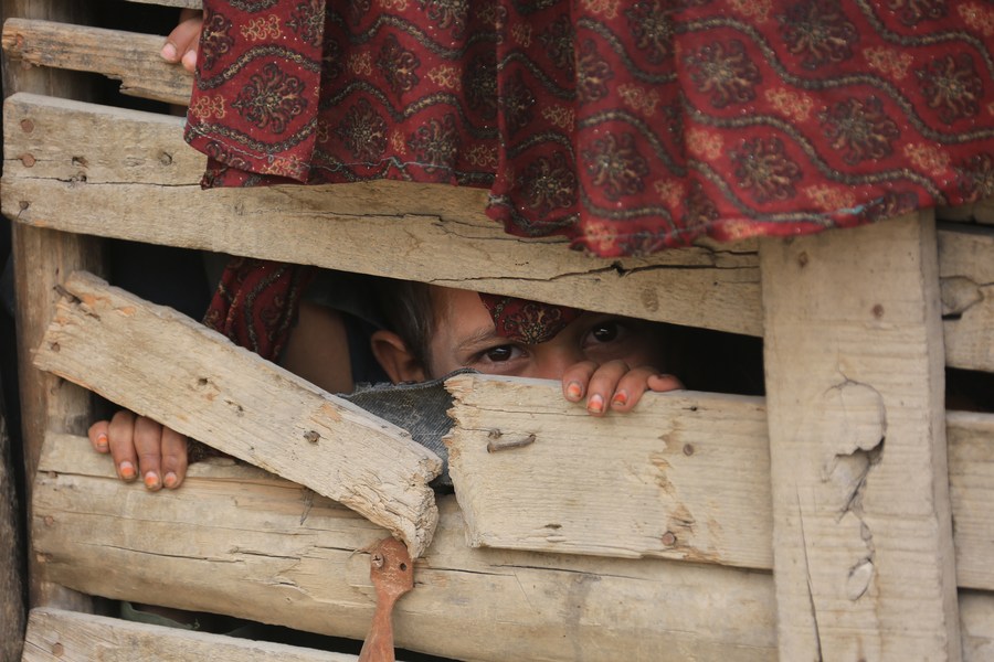 صورة ملتقطة لطفل أفغاني في مخيم للنازحين داخل البلاد في كابول، عاصمة أفغانستان يوم 23 مايو 2023. (شينخوا)
