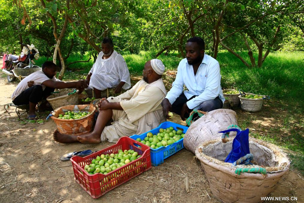 كسلا (السودان) 14 يوليو 2023 (شينخوا) في الصورة الملتقطة يوم 13 يوليو 2023، مزارعون سودانيون يعبؤون ثمار الجوافة في حقل بمدينة كسلا شرقي السودان.
