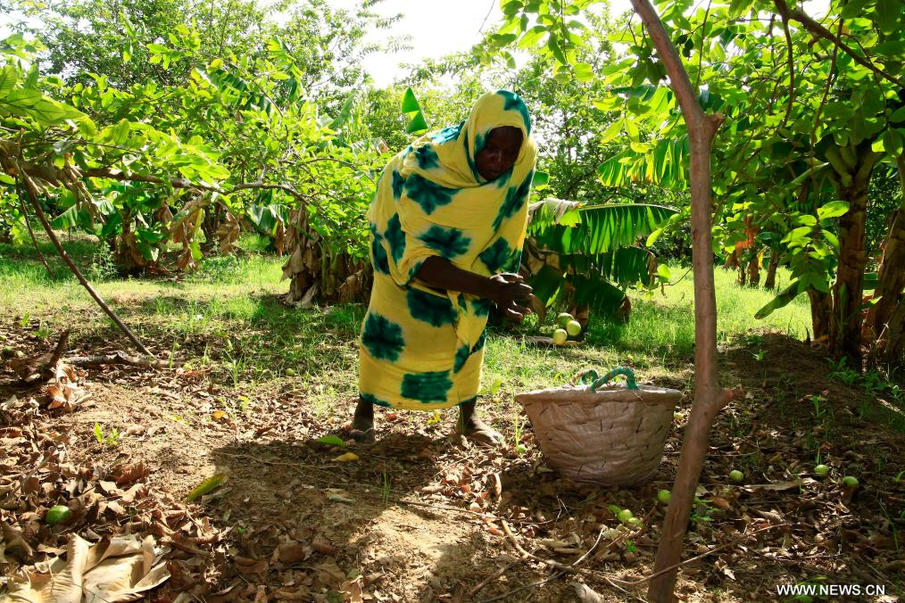 كسلا (السودان) 14 يوليو 2023 (شينخوا) في الصورة الملتقطة يوم 13 يوليو 2023، مزارعة سودانية تقطف ثمار الجوافة من حقل بمدينة كسلا شرقي السودان.