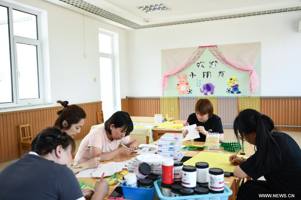 بكين 15 أغسطس 2023 (شينخوا) في الصورة الملتقطة يوم 15 أغسطس 2023، معلمات يجهزن الديكورات استعدادا للفصل الدراسي الجديد الوشيك في روضة أطفال في حي فانغشان في العاصمة الصينية بكين. تبذل المدارس التي تضررت من الأمطار الغزيرة في حي منتوقو وحي فانغشان كل جهد ممكن لتنفيذ إعادة الإعمار بعد الكوارث، والاستعداد للفصل الدراسي الجديد الوشيك. وقد نُفذت عمليات مختلفة وفقا للوضع الخاص بكل مدرسة، منها التكريك والتطهير والصيانة وما إلى ذلك.