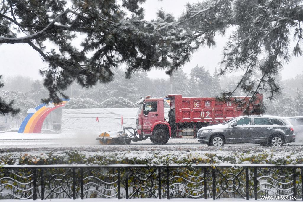 تشانغتشون 7 نوفمبر 2023 (شينخوا) في الصورة الملتقطة يوم 6 نوفمبر 2023، مركبة لإزالة الثلوج تعمل على طريق في مدينة تشانغتشون، حاضرة مقاطعة جيلين بشمال شرقي الصين.