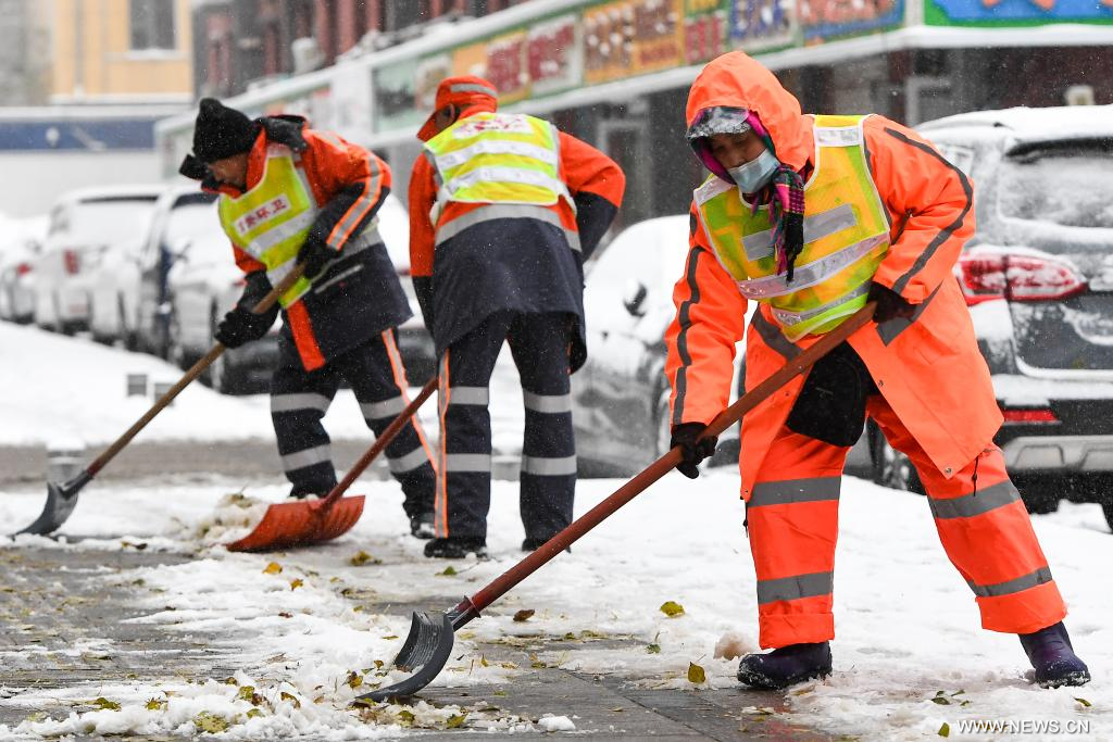 تشانغتشون 7 نوفمبر 2023 (شينخوا) في الصورة الملتقطة يوم 6 نوفمبر 2023، عمال النظافة يزيلون الثلوج من على رصيف جانبي لطريق في مدينة تشانغتشون، حاضرة مقاطعة جيلين بشمال شرقي الصين.