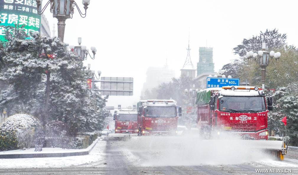 تشانغتشون 7 نوفمبر 2023 (شينخوا) في الصورة الملتقطة يوم 6 نوفمبر 2023، مركبات لإزالة الثلوج تعمل على طريق في مدينة تشانغتشون، حاضرة مقاطعة جيلين بشمال شرقي الصين.