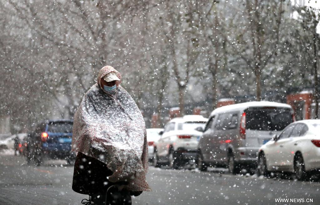 شنيانغ 9 نوفمبر 2023 (شينخوا) في الصورة الملتقطة يوم 8 نوفمبر 2023، رجل يستقل دراجة كهربائية أثناء تساقط الثلوج في حي هوانغقو بمدينة شنيانغ، حاضرة مقاطعة لياونينغ بشمال شرقي الصين. وشهدت شنيانغ جولة جديدة من تساقط الثلوج يوم الأربعاء الماضي، وذلك بعد تساقط ثلوج كثيفة بسبب موجة باردة يوم الاثنين الماضي.