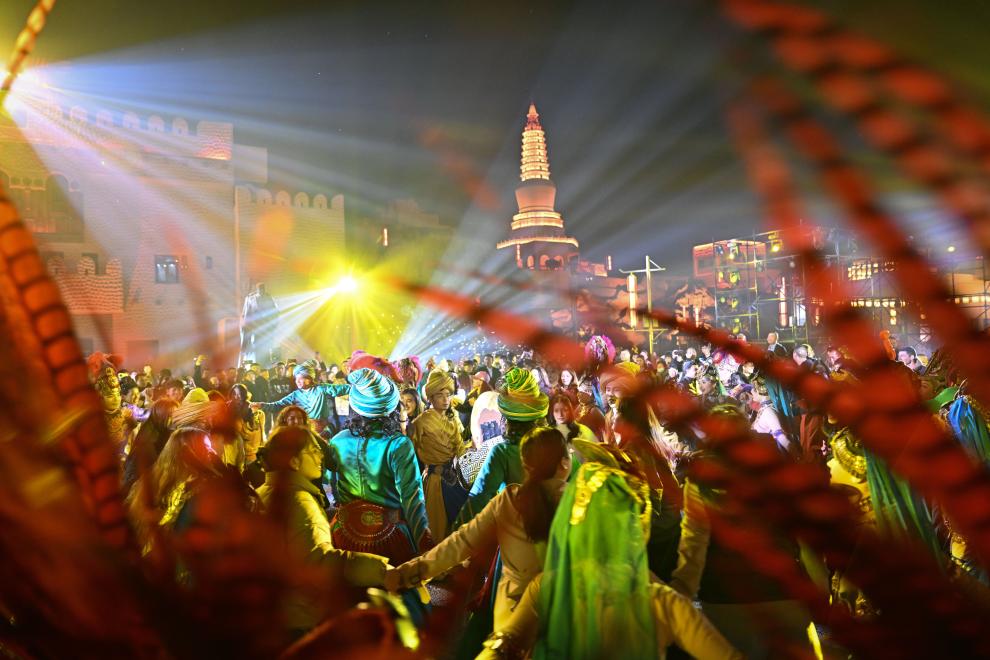 خوتان 10 نوفمبر 2023 (شينخوا) في الصورة الملتقطة يوم 7 نوفمبر 2023، سائحون يرقصون مع الفنانين في منطقة يوتكان الثقافية ذات المناظر الخلابة في محافظة خوتان بمنطقة شينجيانغ الويغورية ذاتية الحكم في شمال غربي الصين.