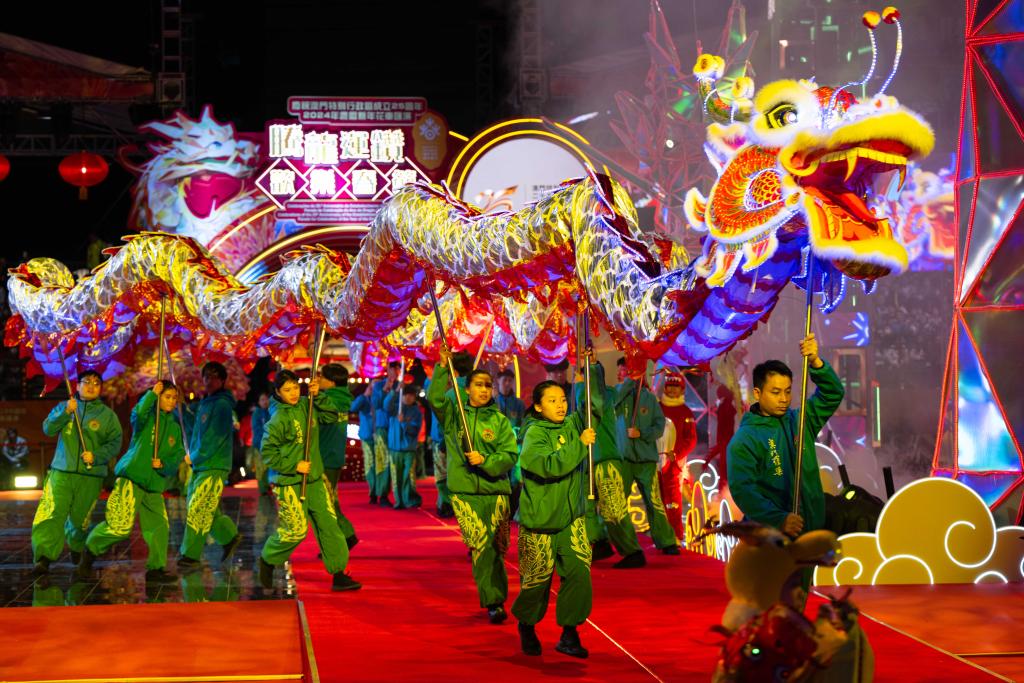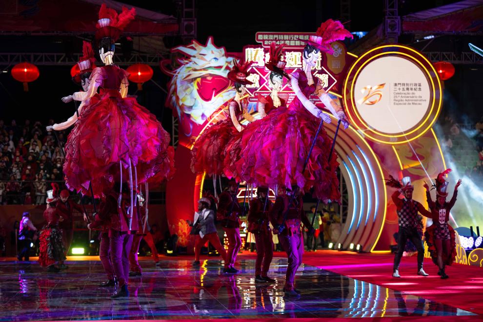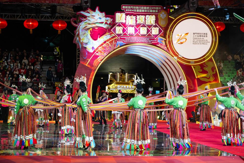 ماكاو 14 فبراير 2024 (شينخوا) في الصورة الملتقطة يوم 12 فبراير 2024، ممثلون يؤدون عروضا خلال احتفالات الذكرى الـ25 لتأسيس منطقة ماكاو الإدارية الخاصة وموكب الاحتفال بعام التنين في ماكاو بجنوبي الصين.