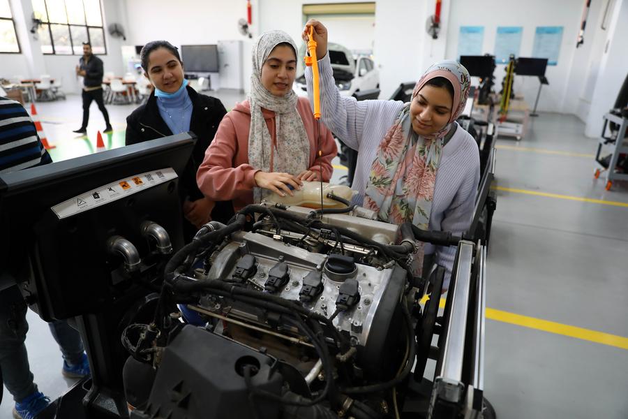 أشخاص يتلقون تدريبا في منطقة التدريب على تكنولوجيا تطبيقات وصيانة السيارات في ورشة لوبان في جامعة عين شمس في القاهرة بمصر في 21 ديسمبر 2022. (شينخوا)