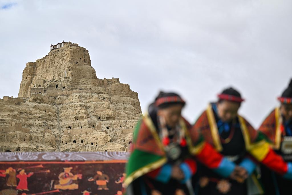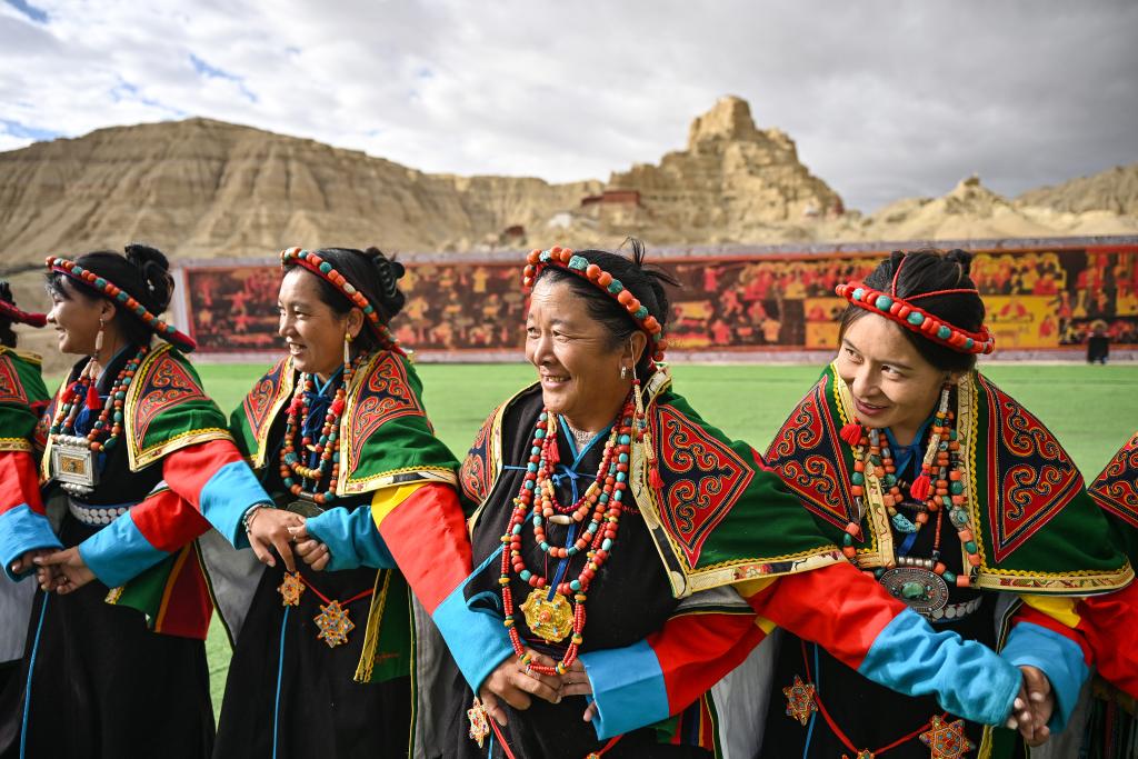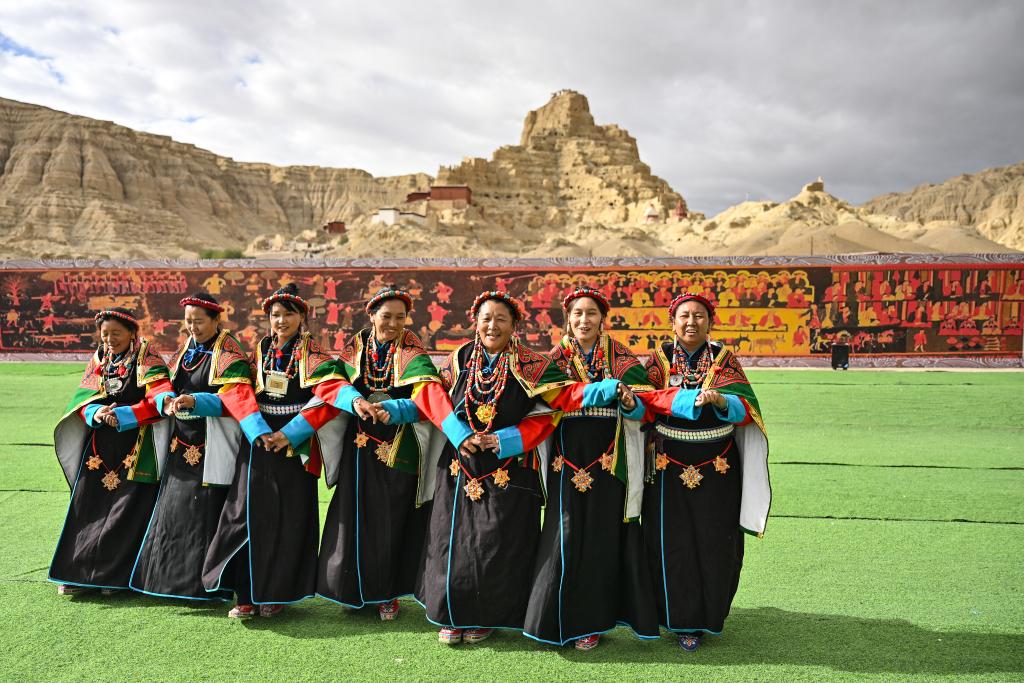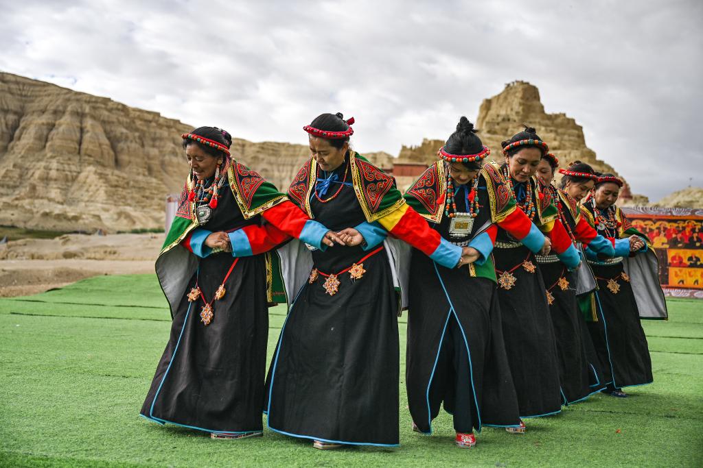لاسا 19 سبتمبر 2024 (شينخوا) في الصور الملتقطة يوم 11 سبتمبر 2024، سيدات محليات يؤدين رقصة "شيوان" بالقرب من أطلال مملكة قوقه في محافظة تساندا بولاية نغاري بمنطقة شيتسانغ ذاتية الحكم بجنوب غربي الصين. وتعد هذه الرقصة التي تمزج بين الكلام والغناء والرقص، تراثا ثقافيا تبتيا من مملكة قوقه القديمة. وقد تم إدراجها في قائمة التراث الثقافي غير المادي الوطني في عام 2008.■
