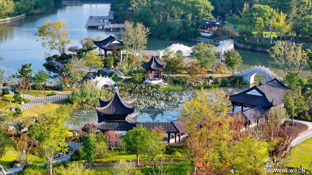 بكين أول نوفمبر 2024 (شينخوا) في الصورة الملتقطة جوا يوم 31 أكتوبر 2024، منظر خريفي جميل في حديقة بمدينة كونشان بمقاطعة جيانغسو بشرقي الصين.