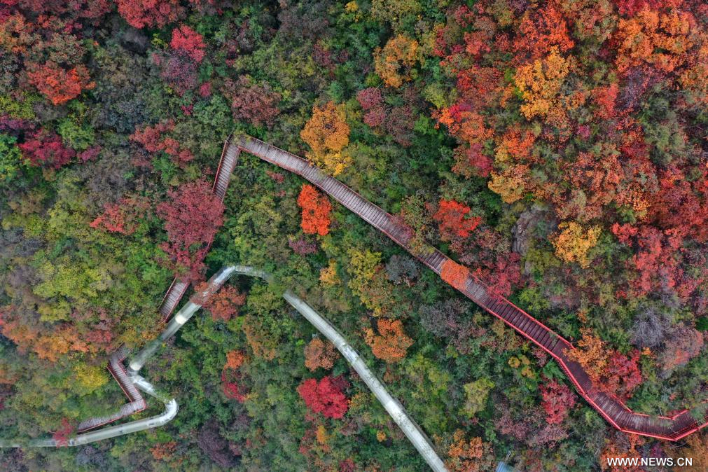بكين أول نوفمبر 2024 (شينخوا) في الصورة الملتقطة جوا يوم 31 أكتوبر 2024، منظر خريفي جميل في تشينيانغ بمقاطعة خنان بوسط الصين.