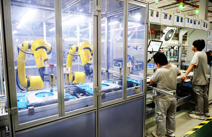 أناس يعملون في ورشة عمل ذكية لتقنية الجيل الخامس في "مصنع المنارة" التابع لشركة جومو في نانآن بمدينة تشوانتشو بمقاطعة فوجيان جنوب شرقي الصين يوم 17 يونيو 2023. (شينخوا)