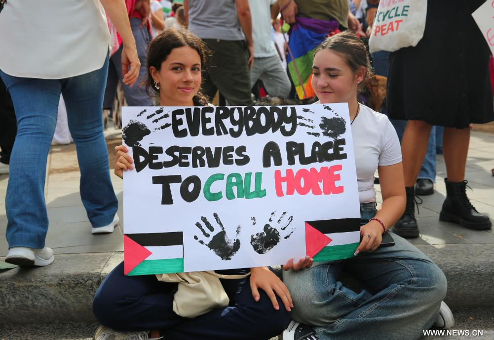 روما 23 سبتمبر 2025 (شينخوا) في الصورة الملتقطة يوم 22 سبتمبر 2025، طلاب يشاركون في احتجاجات مؤيدة للفلسطينيين في روما، إيطاليا.