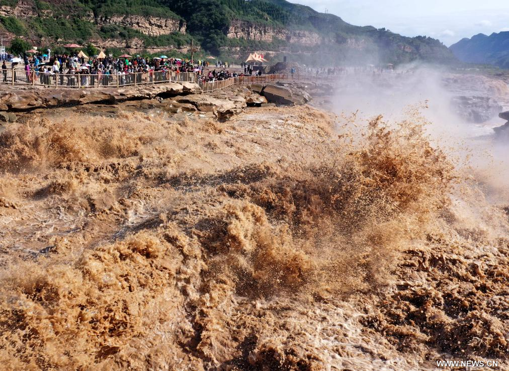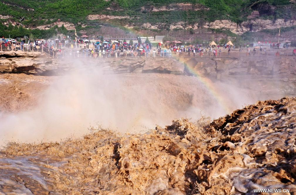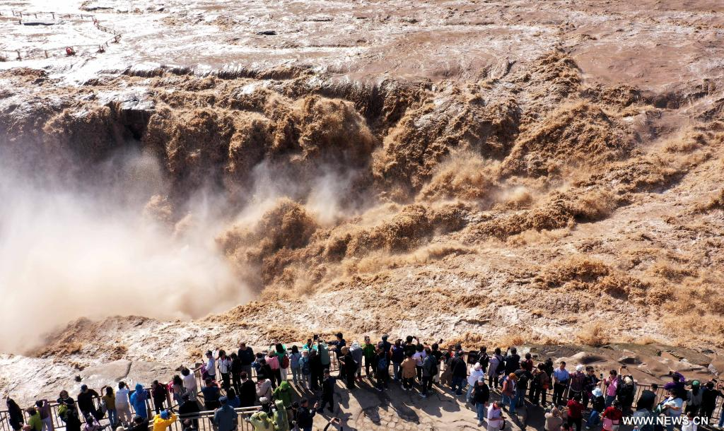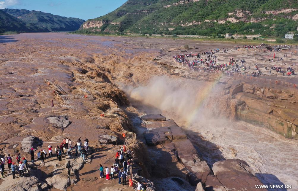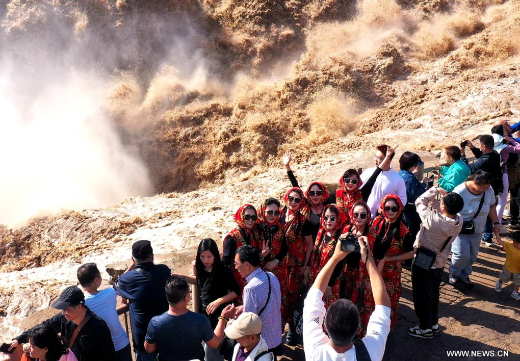 جيشيان 24 سبتمبر 2025 (شينخوا) في الصورة الملتقطة يوم 23 سبتمبر 2025، منظر خريفي خلاب لشلالات هوكو في منطقة شلالات هوكو السياحية على النهر الأصفر بمحافظة جيشيان في مقاطعة شانشي بشمالي الصين.