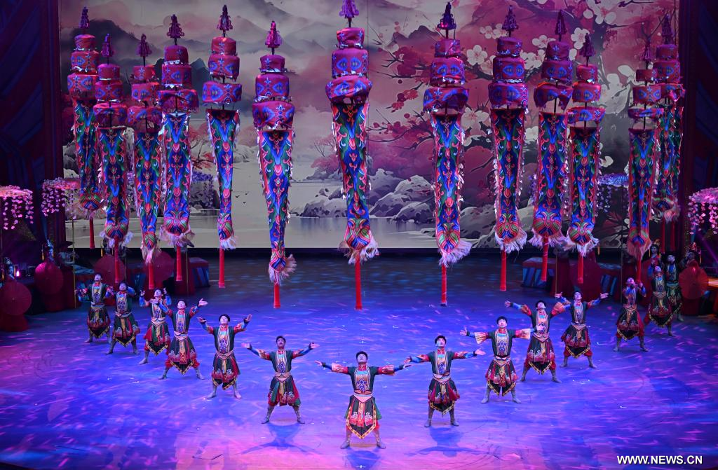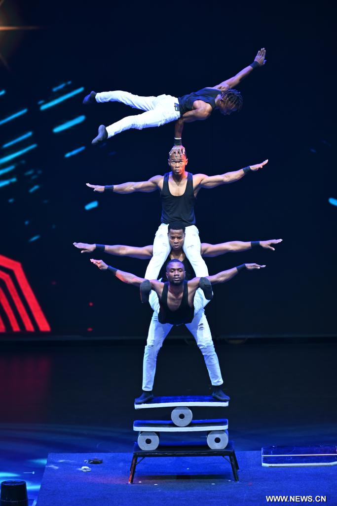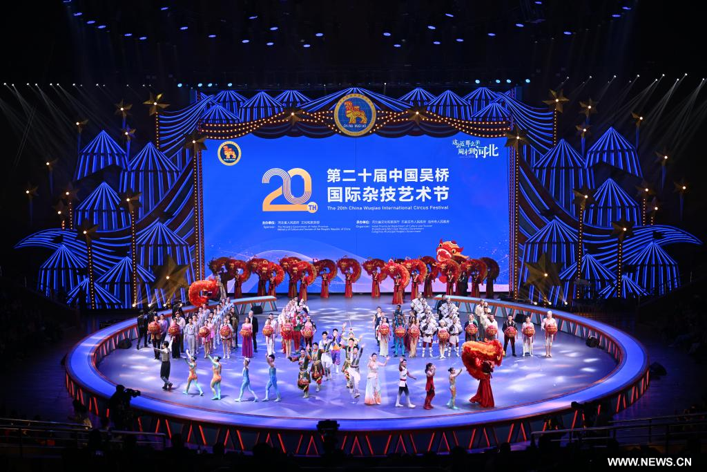 شيجياتشوانغ 29 سبتمبر 2025 (شينخوا) في الصورة الملتقطة يوم 28 سبتمبر 2025، عرض في المراسم الافتتاحية للدورة العشرين لمهرجان ووتشياو الصين الدولي للعروض البهلوانية التي تقام في محافظة ووتشياو المعروفة باسم "مسقط رأس الألعاب البهلوانية"، بمقاطعة خبي بشمالي الصين.