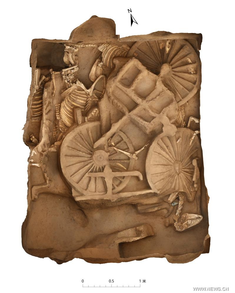 كما اكتشف علماء الآثار خمسة حفر تحتوي على بقايا عربات وخيول.
