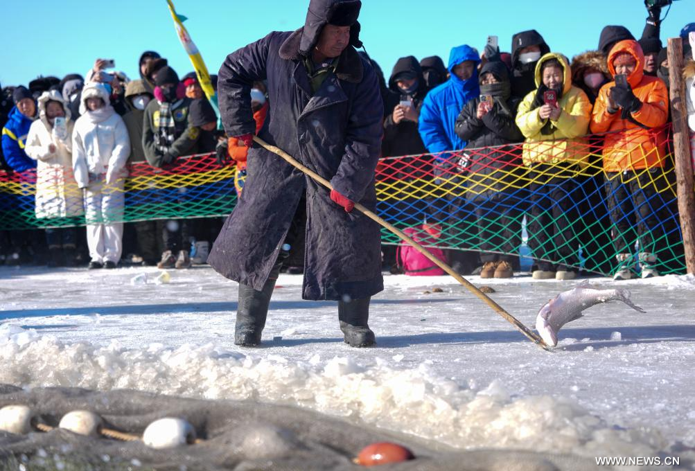 الصيد الشتوي للأسماك في بحيرة تشاقان بشمال شرقي الصين