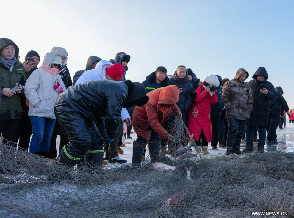 سونغيوان 9 يناير 2026 (شينخوا) في الصورة الملتقطة يوم 8 يناير 2026، زوار يشاهدون عملية صيد الأسماك على الجليد في بحيرة تشاقان المتجمدة بمدينة سونغيوان في مقاطعة جيلين بشمال شرقي الصين.