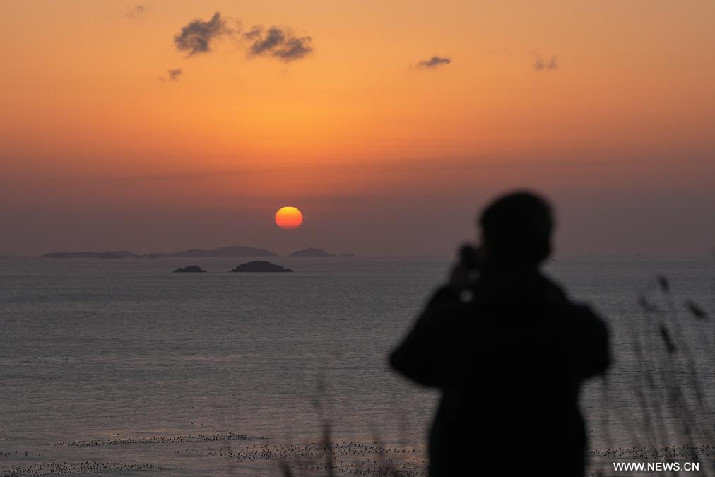 تشوشان 29 يناير 2026 (شينخوا) في الصورة الملتقطة يوم 28 يناير 2026، زائر يأخذ صورا لمنظر غروب الشمس في جزيرة هوانياو بمدينة تشوشان في مقاطعة تشجيانغ بشرقي الصين.