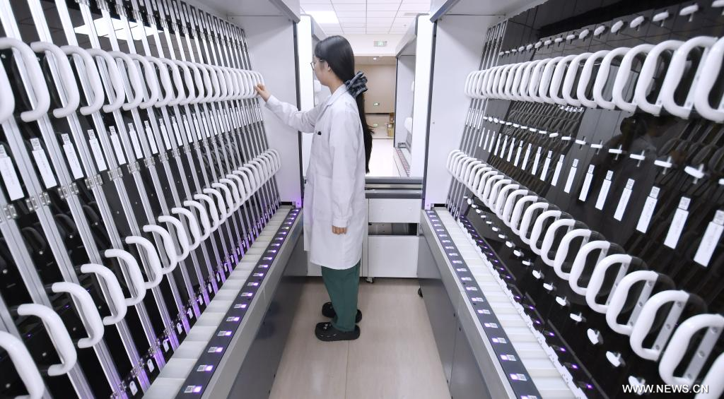 بكين 5 فبراير 2026 (شينخوا) في الصورة الملتقطة يوم 3 فبراير 2026، عاملة طبية تقوم بفحص نظام روبوتي لتوزيع محلول الحقن في فرع تونغتشو التابع لمستشفى بكين آنتشن في العاصمة الصينية بكين.