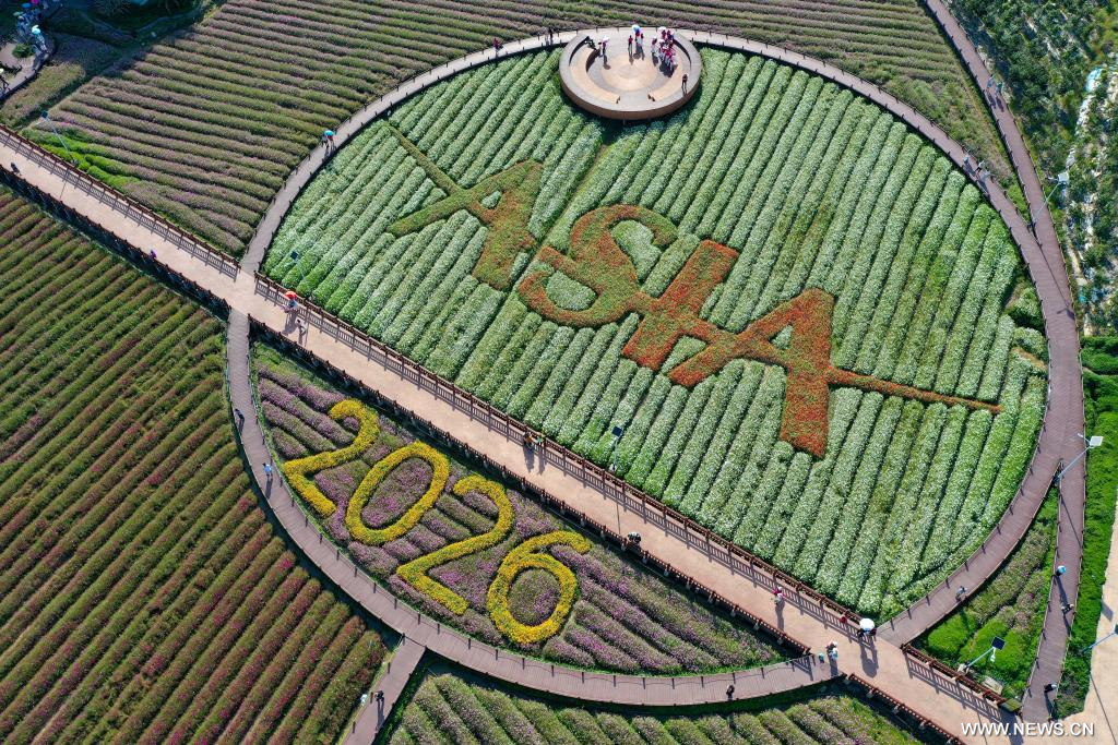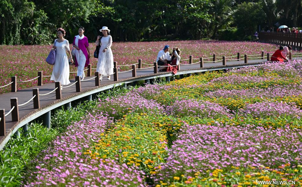 بوآو 19 مارس 2026 (شينخوا) في الصورة الملتقطة يوم 17 مارس 2026، حقول الزهور في قرية نانتشيانغ ببلدة بوآو في مدينة تشيونغهاي بمقاطعة هاينان جنوبي الصين، حيث دخلت الزهور مرحلة الإزهار الكامل، ما يجذب السياح للتنزه.