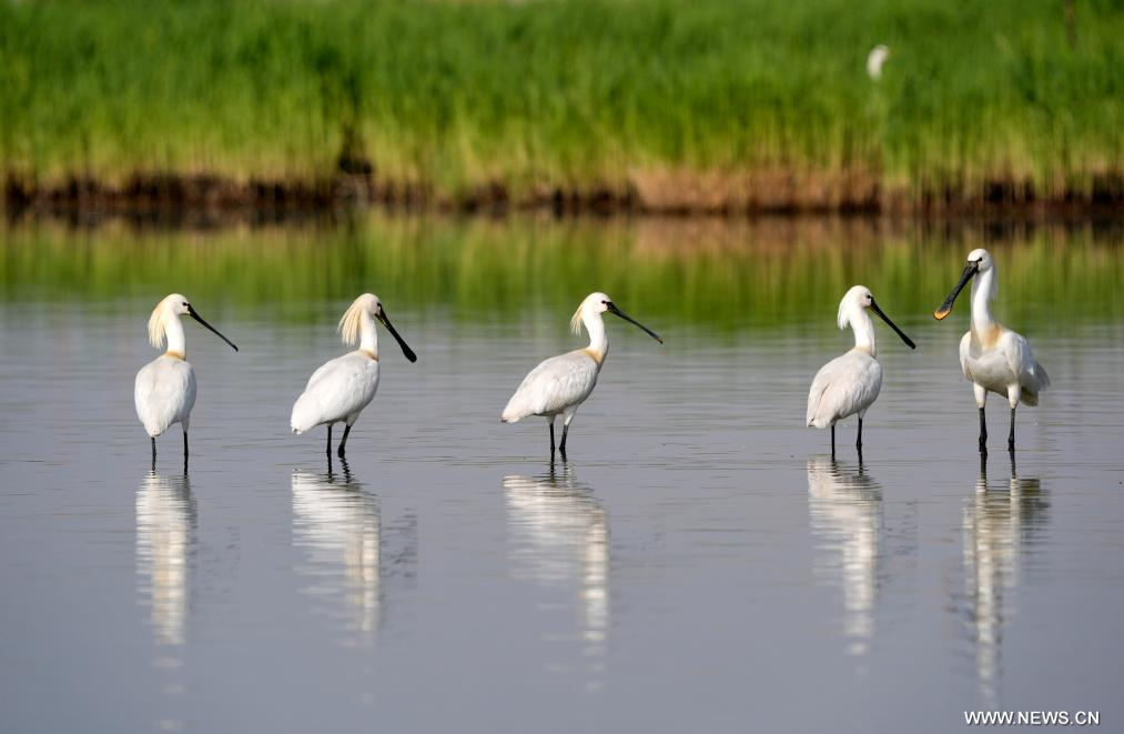 يينتشوان 19 أبريل 2026 (شينخوا) في الصورة الملتقطة يوم 18 أبريل 2026، طيور أبو ملعقة الأوراسية تستريح في بحيرة شاهو بمحافظة بينغلوه في منطقة نينغشيا ذاتية الحكم لقومية هوي بشمال غربي الصين.