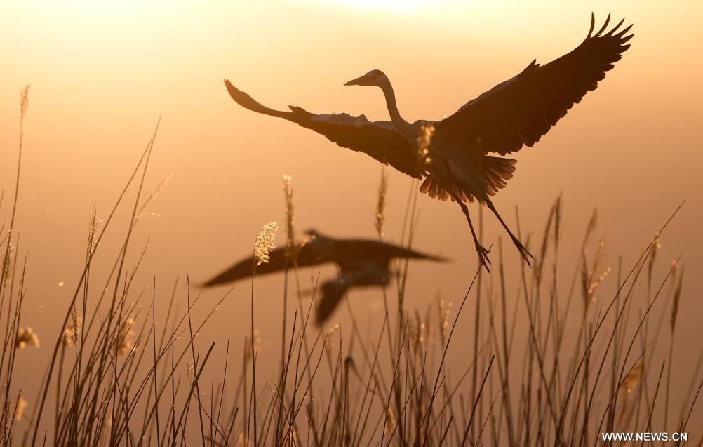 يينتشوان 19 أبريل 2026 (شينخوا) في الصورة الملتقطة يوم 17 أبريل 2026، اثنان من طيور مالك الحزين يحلقان بين القصب في منطقة شاهو السياحية بمحافظة بينغلوه في منطقة نينغشيا ذاتية الحكم لقومية هوي بشمال غربي الصين.