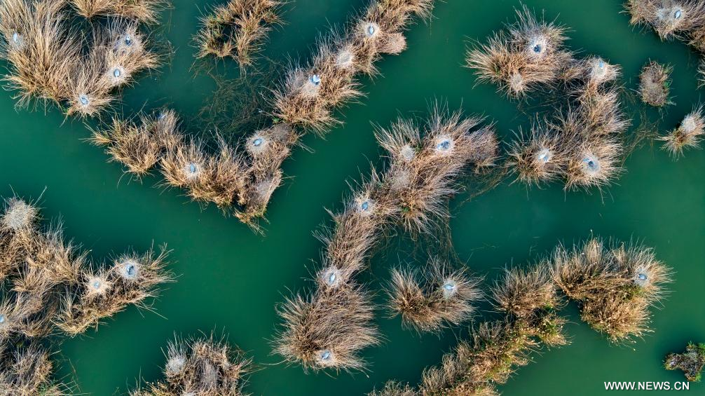 يينتشوان 19 أبريل 2026 (شينخوا) في الصورة الملتقطة يوم 18 أبريل 2026، أعشاش طيور مالك الحزين في منطقة شاهو السياحية بمحافظة بينغلوه في منطقة نينغشيا ذاتية الحكم لقومية هوي بشمال غربي الصين.